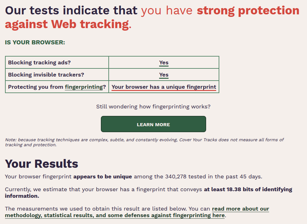 プライバシーブラウザ(Cover Your Trackの測定結果)